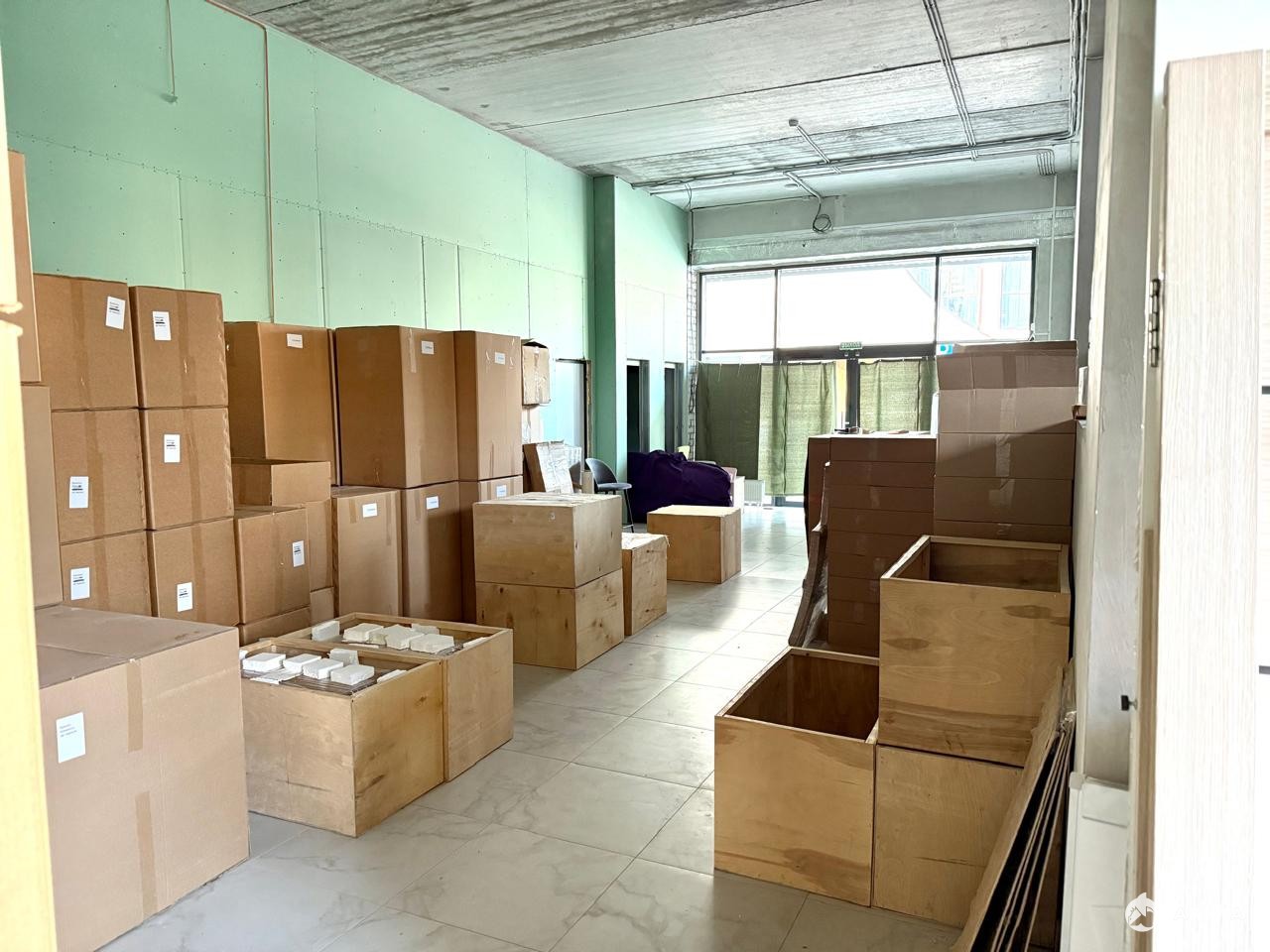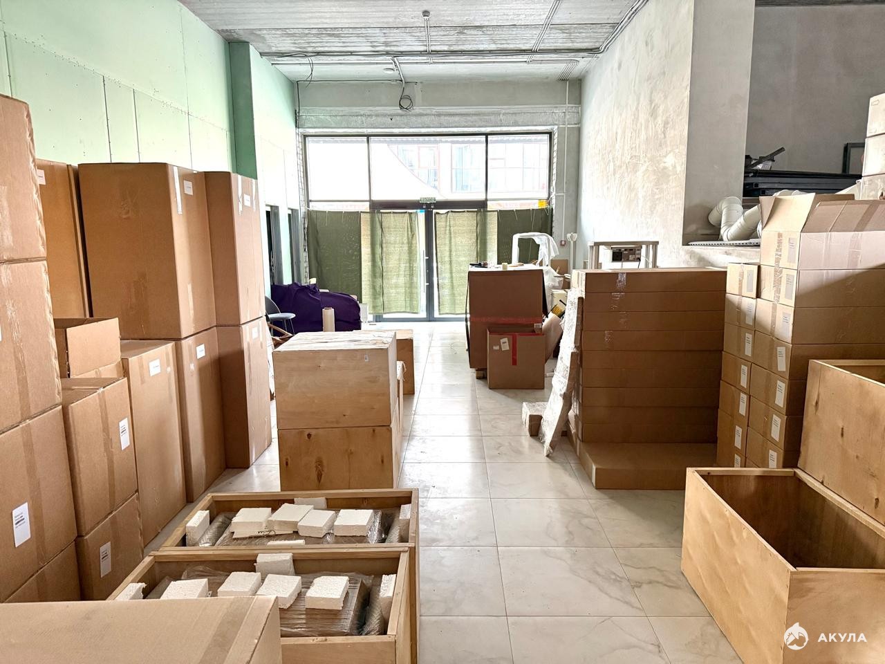 Помещение разделено на зоны: общий зал, склад, возможная зона кухни/выделенная разными уровнями зона, склад. В помещении два входас улицы, со двора.