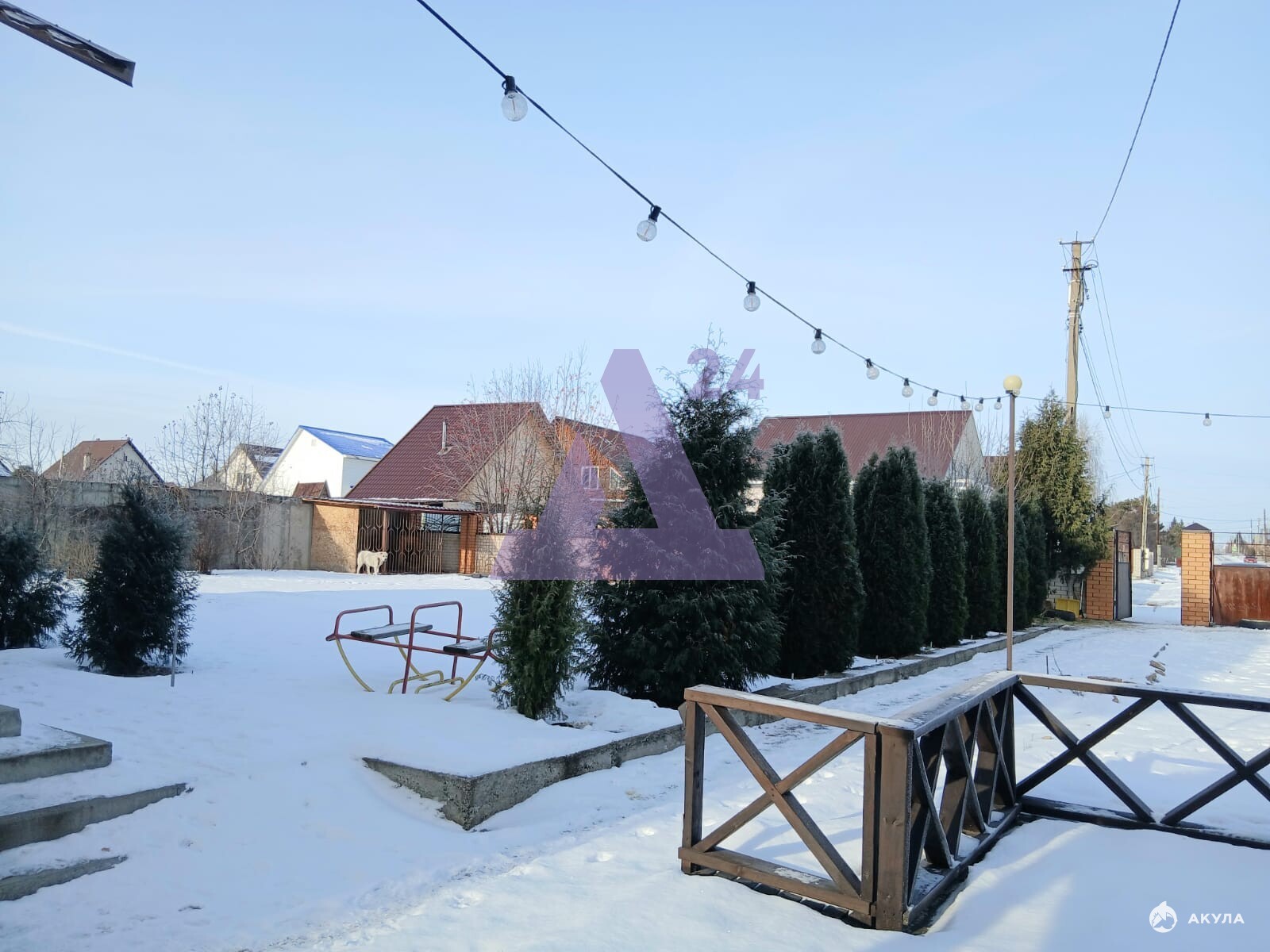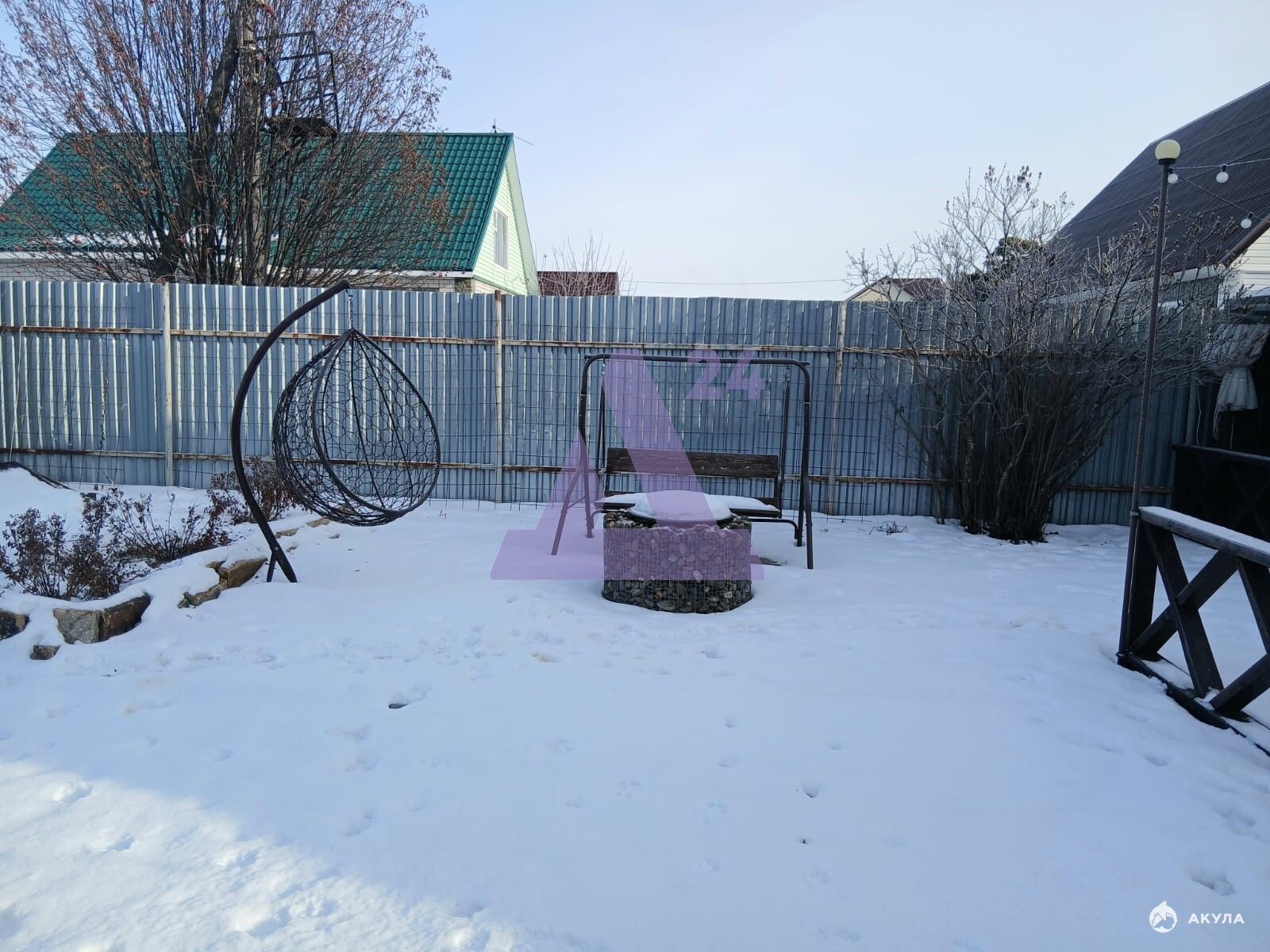 На участке площадью 11 соток — ухоженный плодоносящий сад: яблони, груши, смородина, жимолость, виноград и вишня. Вдоль дорожки растут взрослые туи, создавая зелёный коридор. Есть зона отдыха с шатром и костровищем, где можно собираться с семьёй или друзьями.