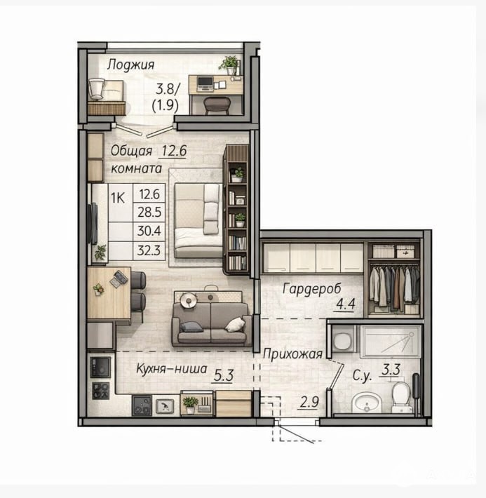 Преимущества квартиры: Удобная планировка и просторная лоджия
