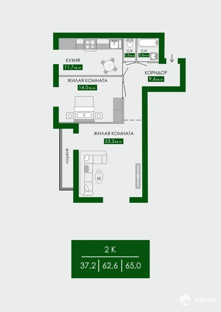 Арт. 93724058. Ваша идеальная двушка в локации «Времена года»: стены готовы, штукатурка ровная , ремонт — под вашу фантазию!